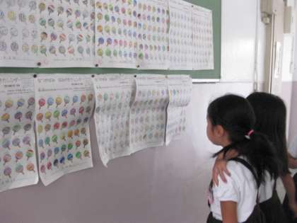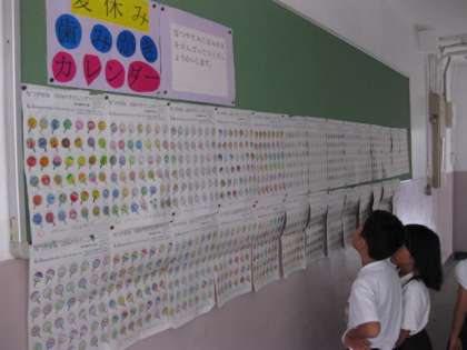 保健室前に、みんながいろぬりをしたカレンダーが貼っています。