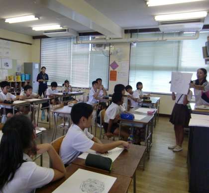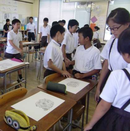 授業の中では、相互鑑賞をして友だちの作品のおもしろいところや工夫したところを発表しました。そして授業の終わりには、「最初は何気なく描いていたけれど、途中から前方後円墳のような形をイメージして描きました。」と、自分の描いた作品についてみんなに伝えることができました。