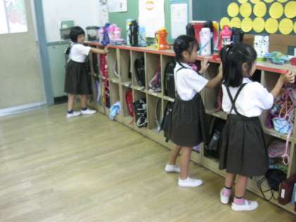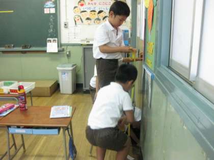 1年生の算数の時間です。紙テープを使って教室のものの長さを測っています。「はしっこ持って」「ロッカーはどれくらい長いのかな」と声をかけあい、班のお友だちと協力していました。長さを測った紙テープを黒板に貼って、みんなが調べたものの長さを比べました。