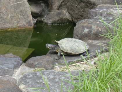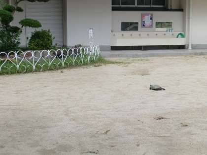 運動場に何か、黒いものが・・・。「なんだろう。」と近づいてみると、黒いものの正体は「カメ」でした。隣の幼稚園から小学校の池まで、のそのそ歩いてやってきました。カメはこうら干しをしながら、次はどこに行こうか考え中のようです。