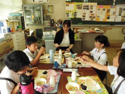 今日は3年生の教室にアン先生がやってきました。「ぶどうは英語でなんて言うの?」と質問などをしながら、楽しく給食を食べました。食べ終わった後は、英語でじゃんけんにチャレンジ!とても盛り上がっていました!