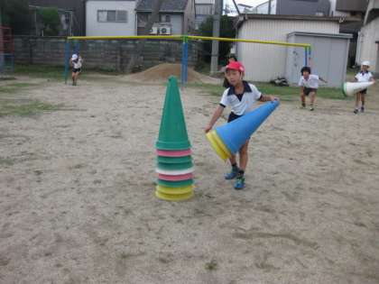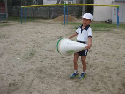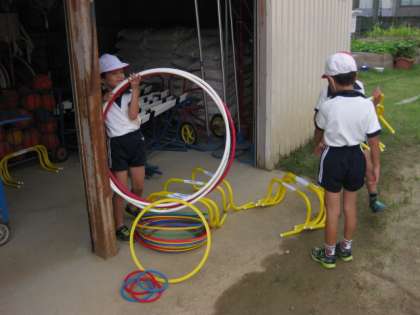 休み時間に、体育の学習で使うハードルやコーン、フラフープを準備していました!
