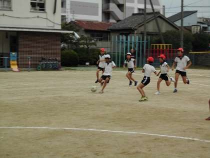 今日のスポーツクラブでは「サッカー」をしました。赤白チームに分かれ、対戦です。前半・後半の間には作戦タイムがあります。「○○をマークしよう」「パスを細かく回そう」と、相手チームの様子から作戦を考えていました。名前を呼ぶなど、チームで声を掛け合っていました。