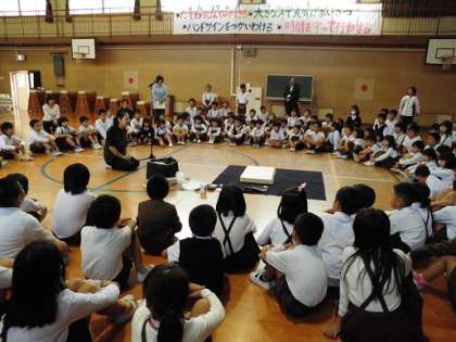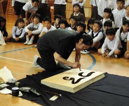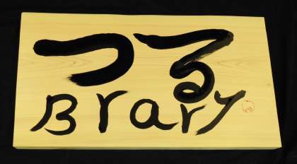 書道家の先生に来ていただき、「つるぶらりぃ」の看板を書いていただきました。ヒノキの板の上に筆で書いています。書きはじめから、書き終わるまで、「シーン」とその場にいるみんなが息をひそめているような時間でした。完成した看板に、全校児童から大きな拍手が沸き起こりました。