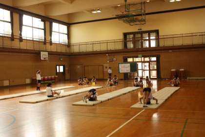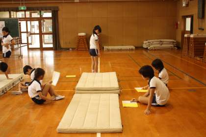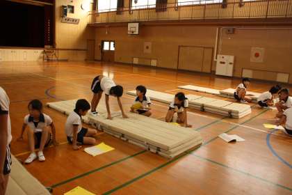 体育の時間のマット運動で、技のポイントを友だち同士でチェックし合いながら、しんしつ後転の練習をしました。友だちからアドバイスをしてもらうことで、技が上達しました。