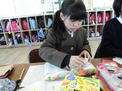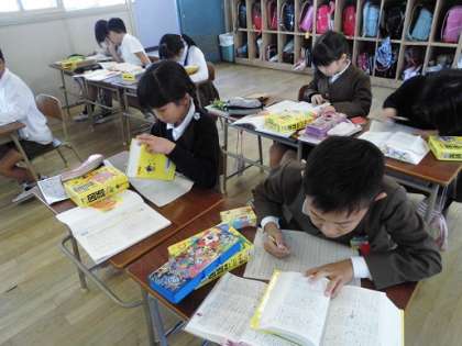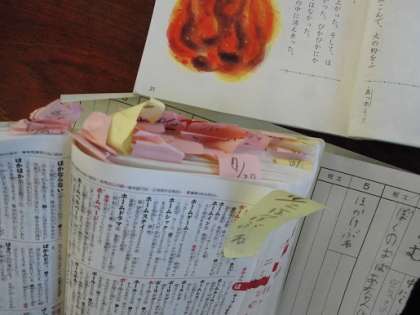 3年生は国語の教科書に出てくる言葉の意味を、国語辞典を使って調べています。意味を調べた後は、その言葉で短文も作ります。国語辞典には、意味を調べた言葉のふせんがたくさん!辞書を引くのも、だんだん早くなっています!