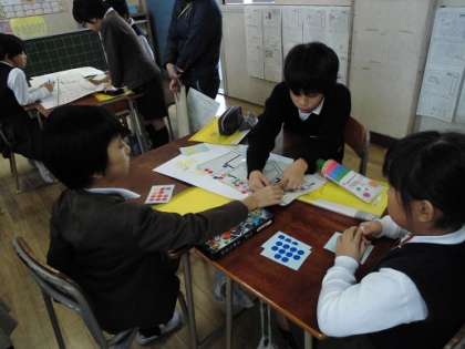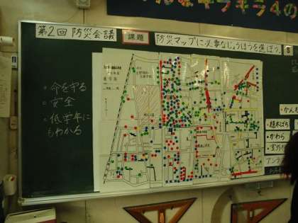 4年生の総合的な学習の時間の様子です。今日は防災地図にのせる必要な情報について話し合いました。危険なところには、シールをはって見やすくしています。低学年にもわかりやすい地図になるように、これからも考えていきます。