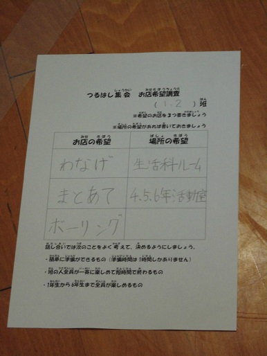 今日の児童集会では、1月31日の「つるっ子まつり」に出すお店について班ごとに話し合いました。各班では「的当て」や「わなげ」などの案が出ていました。決定したお店は来週の児童朝会で、鶴橋向上委員会が発表します。それぞれの班がどんなお店に決まったのか楽しみですね!
