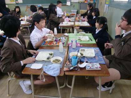 1年生と6年生の交流給食の様子です。お姉さんやお兄さんと一緒に給食を食べることができて、とても嬉しそうでした!