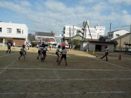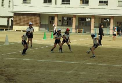 4年生の体育の学習の様子です。フットサルをしています。「こっちー!」「パスして!」と、声をかけ合っていました。チームで協力して、パスをつないでいました。