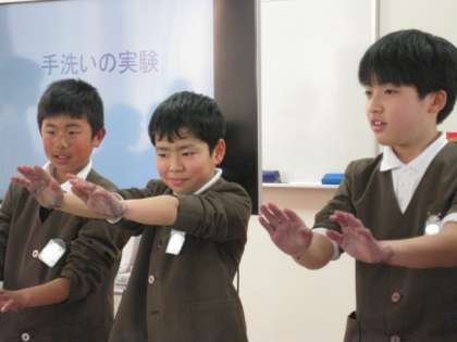 写真中「普通に洗うチーム」は、若干、指の間や手首によごれあり。