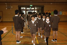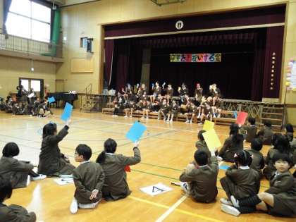 今日は「卒業をお祝いする会」がありました。5年生がリコーダーを演奏する中、6年生が入場しました。「最後の思い出作ろうゲーム」では、1〜5年生は6年生の答えを話し合って予想しました。「6年間の一番の思い出は何ですか?」という問題では、修学旅行と答えた6年生が多かったです。
