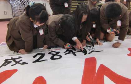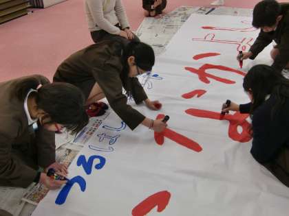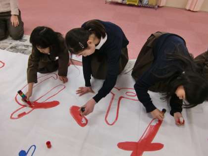 今年度の鶴橋小学校全体のつるブラは「みんな なかよし」に決まりました。そのつるブラの、講堂に掲げる横断幕を鶴橋小学校のみんなで作っています。今日は2年生と5年生が担当です。「ここお願いね!」「きれいにぬれているね!」と声をかけ合って、一緒に横断幕に色を塗りました。もう少しで完成です!