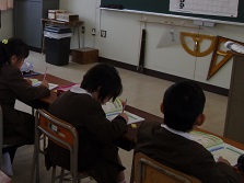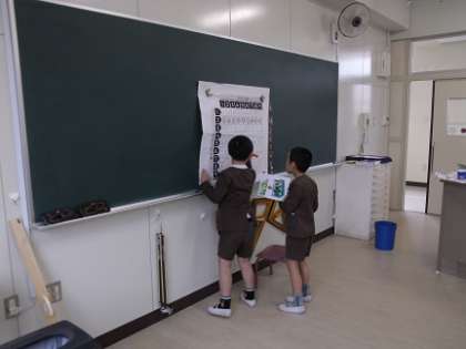 3年生の算数では、かけ算の復習をしました。一人ずつ前に出て、九九の表に答えを書き込みました。みんなで協力して、楽しく活動していました。