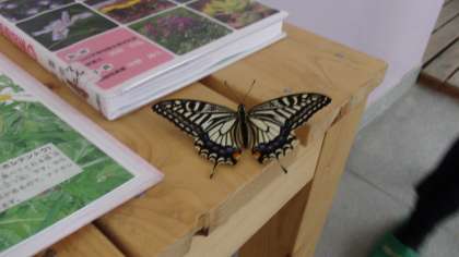 なんだろう・・と見に行くと、なんと本が置いてある棚の上にきれいなアゲハチョウがとまっていました!!!この前ちょうどチョウの勉強をしたばかり。