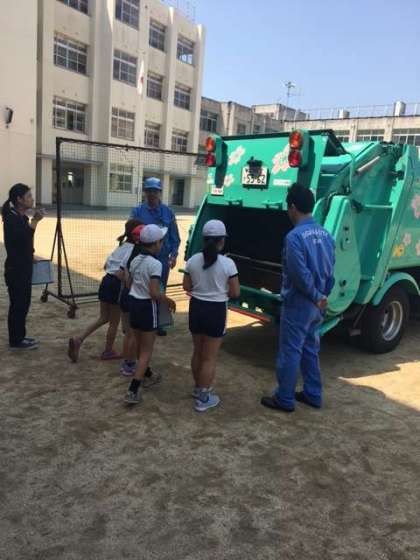 大阪市環境局の方に来ていただき、パッカー車を見せてもらいました。ゴミ収集の仕方を詳しく教えていただきました。分かったことを整理して、考えを深めていきたいと思います。