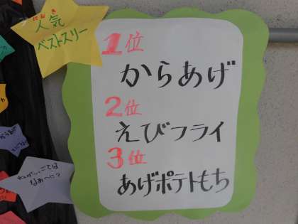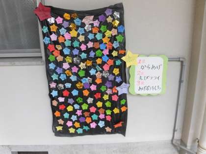 給食室の前には、子どもたちそれぞれの「好きな揚げ物」が書かれた星がたくさん輝いています!!!