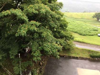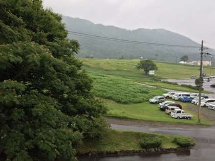 雨が降って来ました。カミナリも鳴っているので、山登りを中止して宿舎に帰って来ました。キャンプファイヤーの練習などして過ごします。