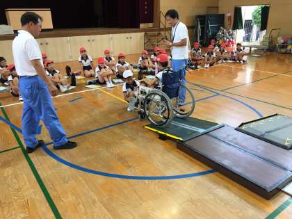 大阪市心身障害者リハビリセンターの方々に車椅子での介助の仕方を教えていただきました。