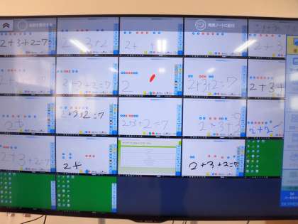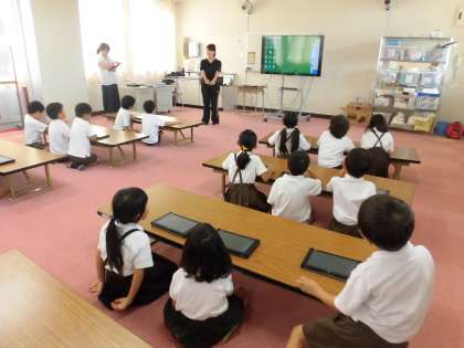 1年生は、操作方法を教えていただいてから、算数の3つの数の計算をしました。