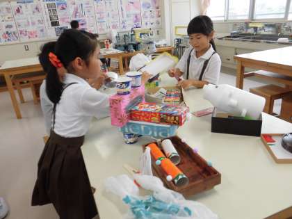 テープや接着剤を使って、箱同士を繋げたり、リボンやビーズを飾り付けたり・・・