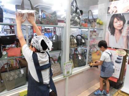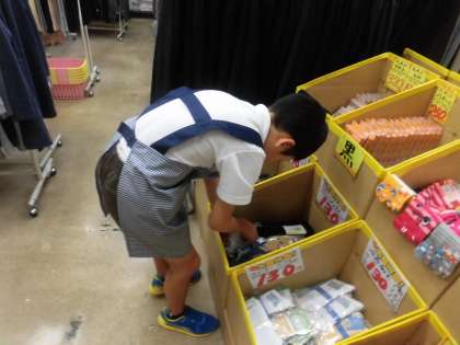 「どのタオルがおススメですか?」とお客さんに聞かれると「このピンクのクマのものです。」と対応する衣服屋さんのミニ店員の姿も。