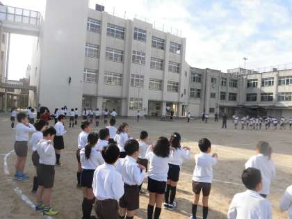 保健体育委員を中心に準備体操をし、はじめは学年ごとに整列してスタートです。
