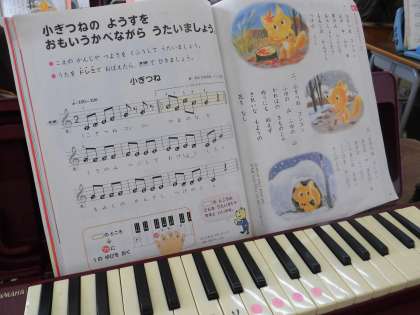 2年生の音楽では、鍵盤ハーモニカで「こぎつね」の演奏をしています。
