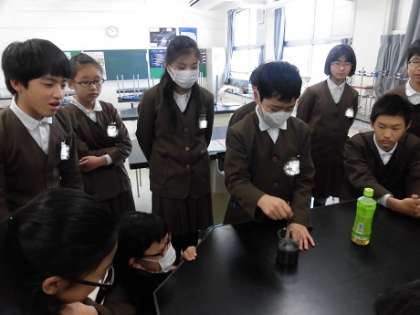 今日は、「薬とお茶」「薬とジュース」を一緒に飲んだ時の実験をしました。