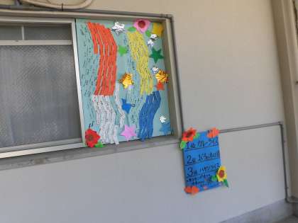 給食調理員さんが、給食室の前に七夕の飾りを作ってくれています。