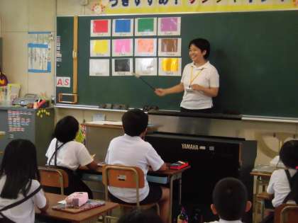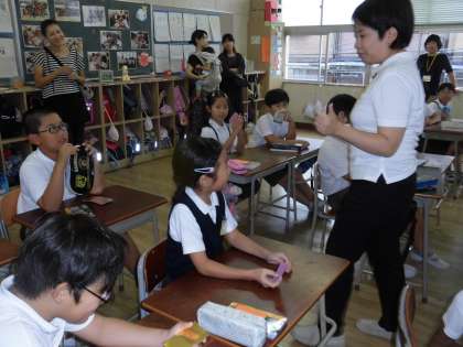 先生の質問に「I like pink.」「I like silver.」とリズムにのって元気よくこたえていました。ノリノリの楽しい1時間でした。