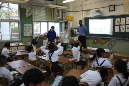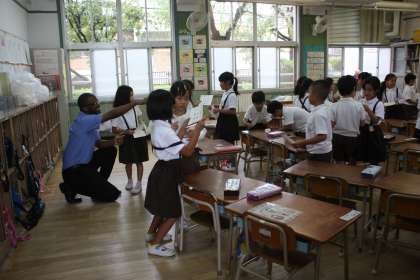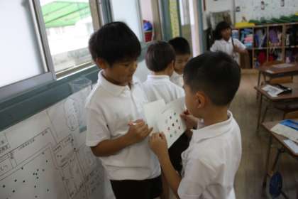 今日は、1年生が始めてアレックス先生と外国語の学習をしましたテーマは色「blue someone ?」「pink someone ?」とアレックス先生の質問をきいて、その色のものを見つけてタッチする学習をしました。みんなとても楽しんで活動することができました。
