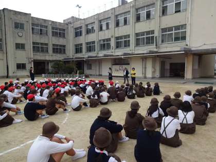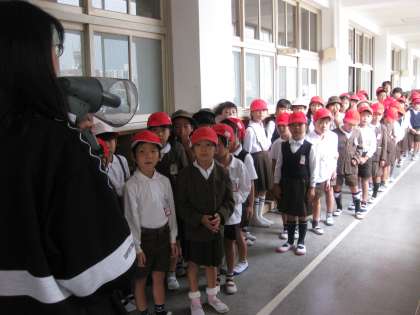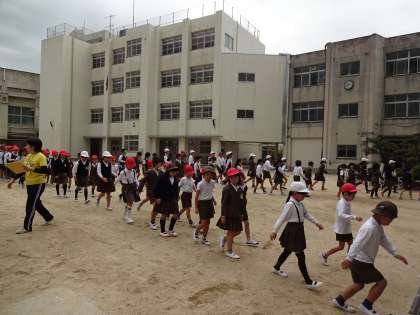 高学年の子どもたちは、鶴橋幼稚園の子どもたちの手を引きながら階段を上がって3階まで避難の練習をしました!