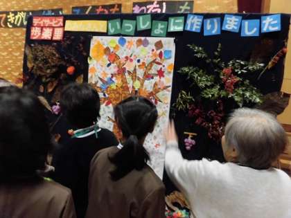 5年生は、総合学習の時間に交流活動をしているデイサービス、歩楽里のみなさんを作品展にご招待しました。一緒に作った作品を鑑賞したり、他の学年の作品を案内したりして、楽しい時間を過ごすことができました。