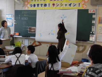 3年生は、社会科の「人とものの動き」で、自分たちの食べている果物や野菜がどこから運ばれてくるのか、スーパーのチラシや写真をもとに調べて日本地図に印をつけながら発表しました。たくさんの品物が日本全国から自分の町に届いてきていることを改めて知りました。