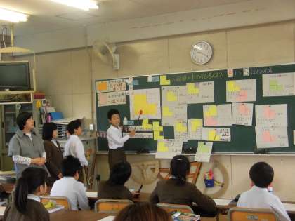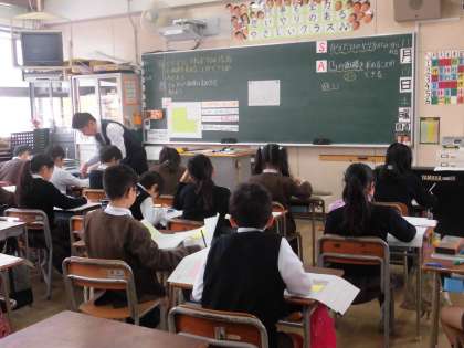 4年生は、算数で「長方形と正方形の面積」の学習をもとに、複合図形の面積の出し方を学習しました。2分割にして求めたり、全体からない部分を引いたりといろいろな考え方で求めることができました。考え方の発表では、説明を3人でリレー形式で行ったり、ペアで説明したりなど、しっかり自分の考えを発表することができました。