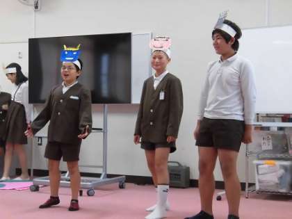 6年生は外国語活動の時間に劇「桃太郎」を英語バージョンで練習してきました。セリフはもちろん全て英語です。手作りの小道具を使ったり、途中に歌を歌ったりとても楽しい内容でした。発音の良いセリフや豊かな表現に、観劇していた4・5年生も驚いていました。