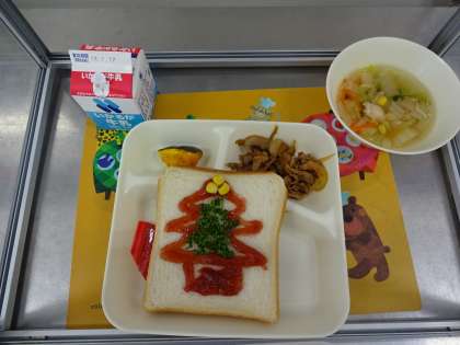 「牛乳・食パン・いちごジャム・豚肉のケチャップソテー・はくさいのスープ・焼きかぼちゃ」でした。