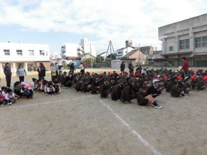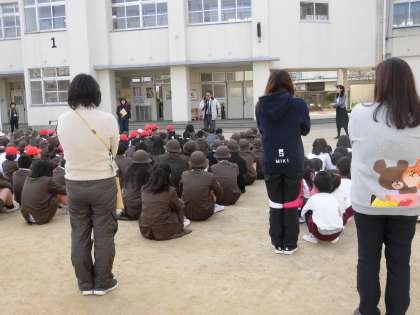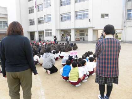 今日は、地震を想定した避難訓練でした。幼稚園も参加し、運動場に避難しました。
