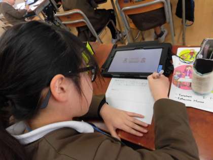 おすすめの場所や食べ物を紹介するスライドを、タブレットを使って作ります。
