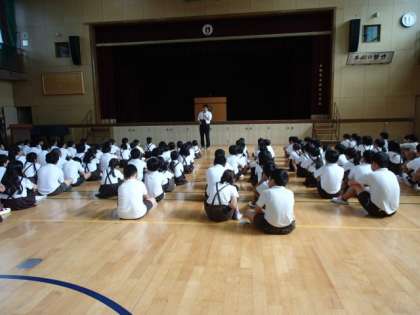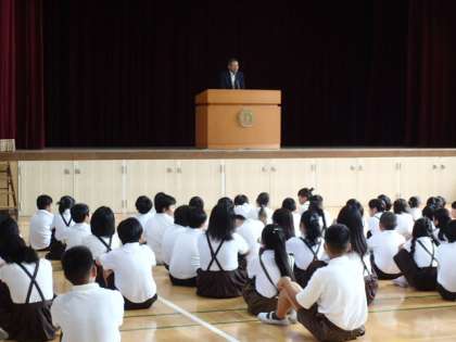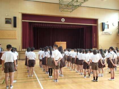 2学期が始まりました。1時間目に第2学期始業式が行われました。服装を整えて整列し、校長先生のお話や、係の先生から生活目標についてのお話を聞きました。