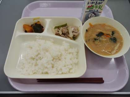 <豚肉の甘辛焼き みそ汁 かぼちゃのいとこ煮 ごはん 牛乳>