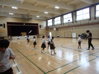 工作教室で作った傘袋ロケットを実際に飛ばしています。投げ方を工夫したり、部品の位置を変えたりと試行錯誤をして楽しんでいました。