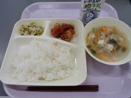 <ヤンニョムチキン とうふのスープ 切干しだいこんのナムル ごはん 牛乳>
