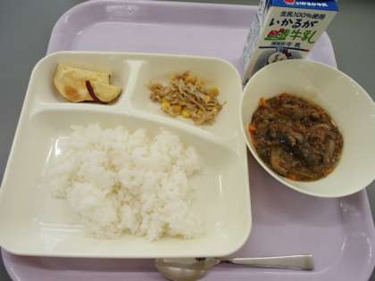 <マーボーなす ツナと野菜のいためもの 焼きさつまいもの甘みつかけ ごはん 牛乳>