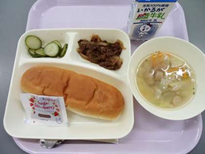 <牛肉のデミグラスソース煮 ウインナーのスープ きゅうりのピクルス コッペパン いちごジャム 牛乳>