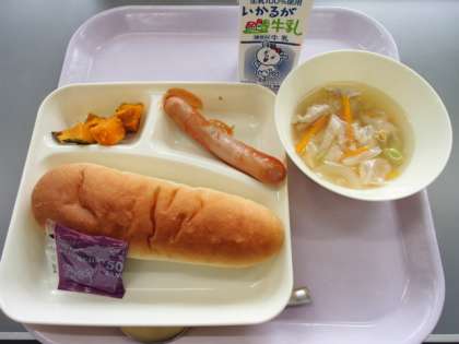 <ウインナーのケチャップソース スープ 焼きかぼちゃ コッペパン ブルーベリージャム 牛乳>