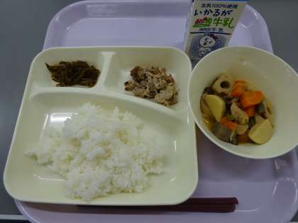 <豚肉の梅風味焼き ふきよせ煮 くきわかめのつくだ煮 ごはん 牛乳>