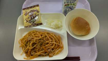 <イタリアンスパゲッティ サワーキャベツ カレーフィッシュ ミニコッペパン 牛乳>