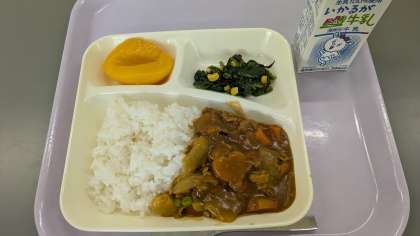 <ポークカレーライス ほうれんそうのソテー 黄桃(缶) 牛乳>
